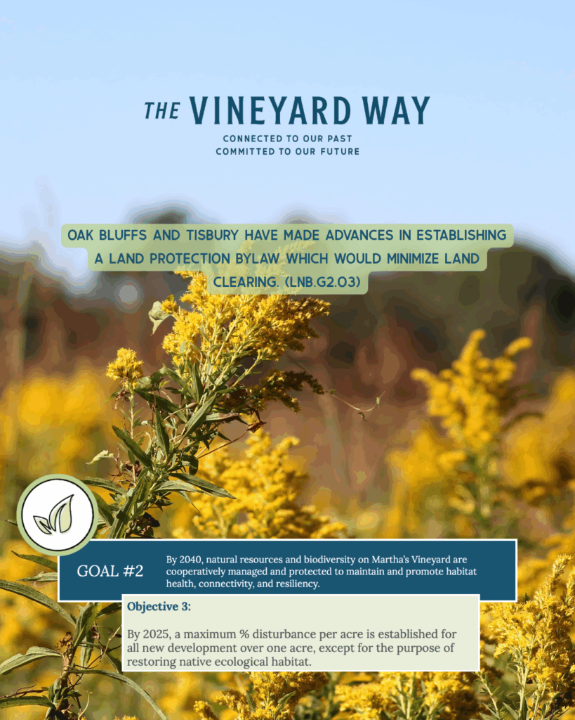 - Oak Bluffs and Tisbury have made advances in establishing a Land Protection Bylaw which would minimize land clearing. (LNB.G2.O3)