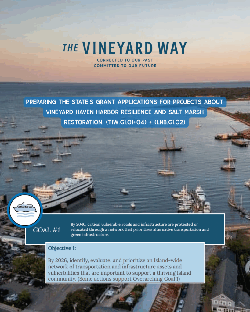 - Preparing the State’s grant applications for projects about Vineyard Haven Harbor Resilience and Salt Marsh Restoration. (TIW.G1.O1+O4) + (LNB.G1.O2)