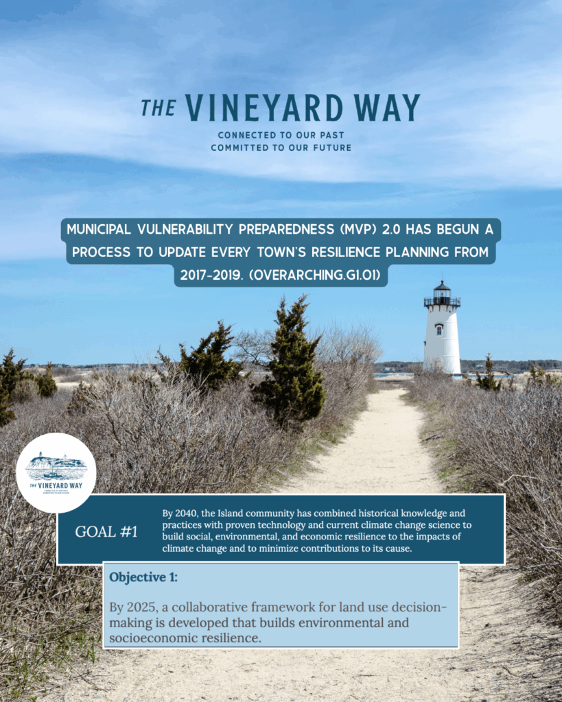 The Vineyard Way — Martha’s Vineyard’s Climate Action Plan (CAP) — was created in 2022 by all six Island towns, the Wampanoag Tribe, and more than 100 community partners. With over 190 actions across six thematic areas, the CAP outlines how we can protect our people, ecosystems, and infrastructure from rising seas, flooding, extreme weather, and drought—always with equity at the center.