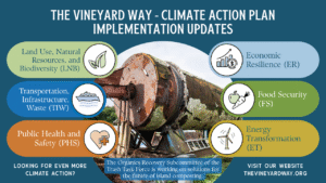 Across Martha’s Vineyard, climate action continues to move from planning to practice — through partnerships, pilot projects, policy development, and community collaboration. From harbor resilience to land protection, waste reduction to public health preparedness, Island leaders and volunteers are steadily advancing the goals of the Climate Action Plan. Here’s a snapshot of the meaningful progress underway and what’s on the horizon, as of December 2025: