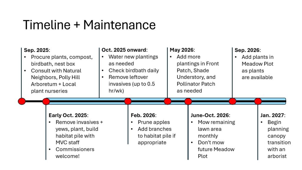 Plant procurement and initial installation began in Fall 2025. Invasive removals and early plantings are underway. Apple trees will be pruned for health and productivity. Additional native plantings will be added in spring and fall seasons. The Meadow Pilot will expand. Canopy transition planning with an arborist begins in 2027.