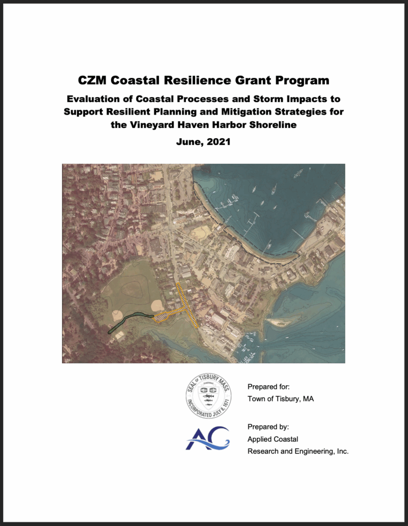 The Town of Tisbury received funding assistance through the Massachusetts Office of Coastal Zone Management (MCZM) FY21 Coastal Resilience Grant Program to develop conceptual flood protection designs for downtown Vineyard Haven. The overall goal was to perform a more detailed assessment of the recommended options and develop conceptual designs for these flood mitigation strategies. Included in the goal of each design was the development of pragmatic shoreline management strategies that would provide resiliency for the Vineyard Haven Harbor shoreline over the next 30 to 50 years.
